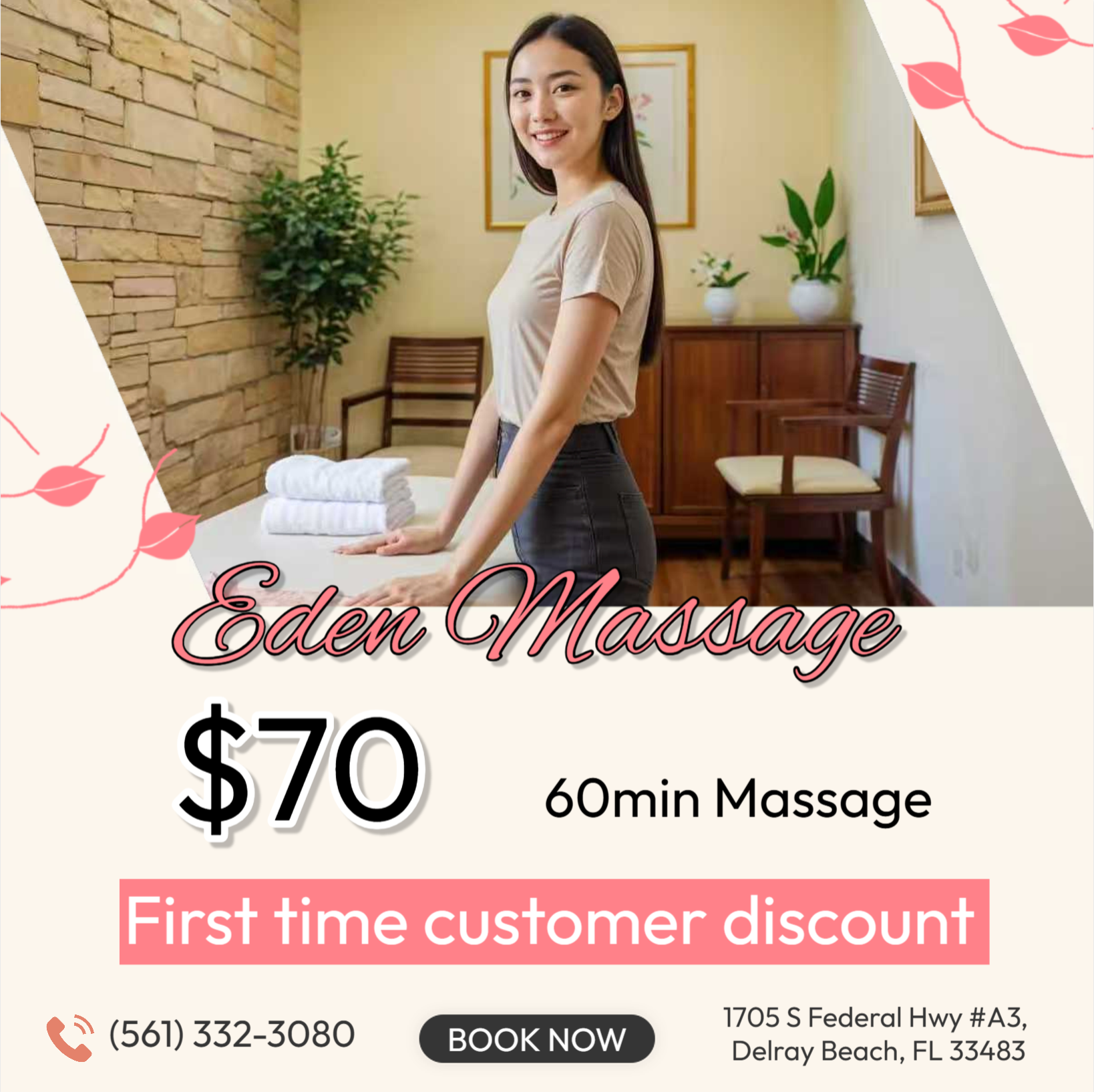 Eden Massage. First time customer. Call for an appointment and get a discount on a 1 Hr. massage!!! Massage is becoming more popular as people now understand the benefits of a regular massage sessio Go to full description...