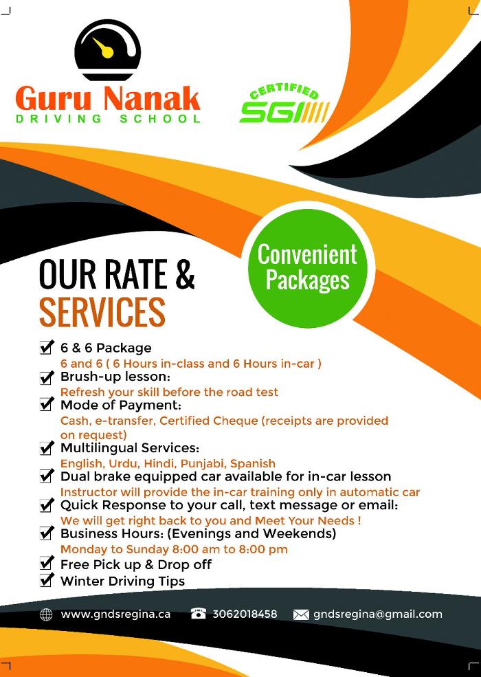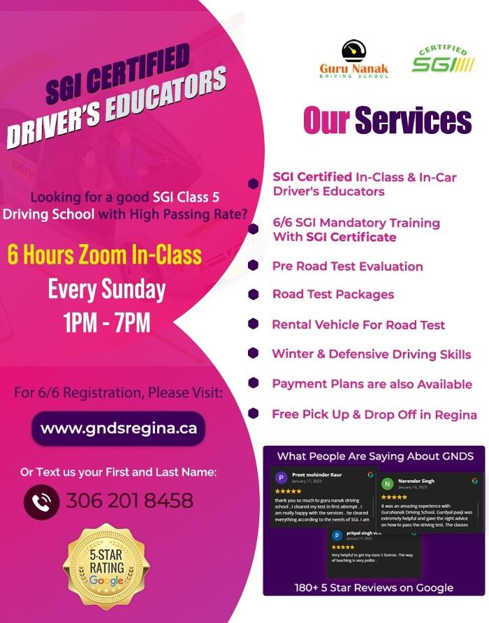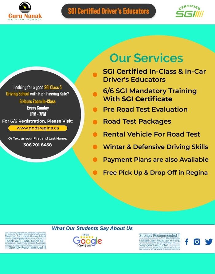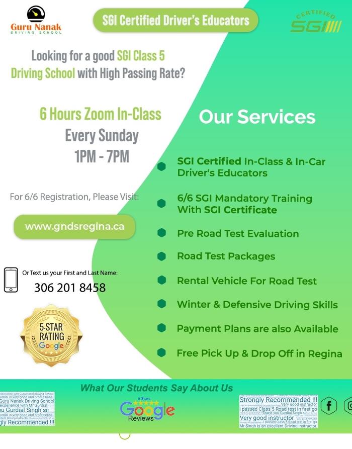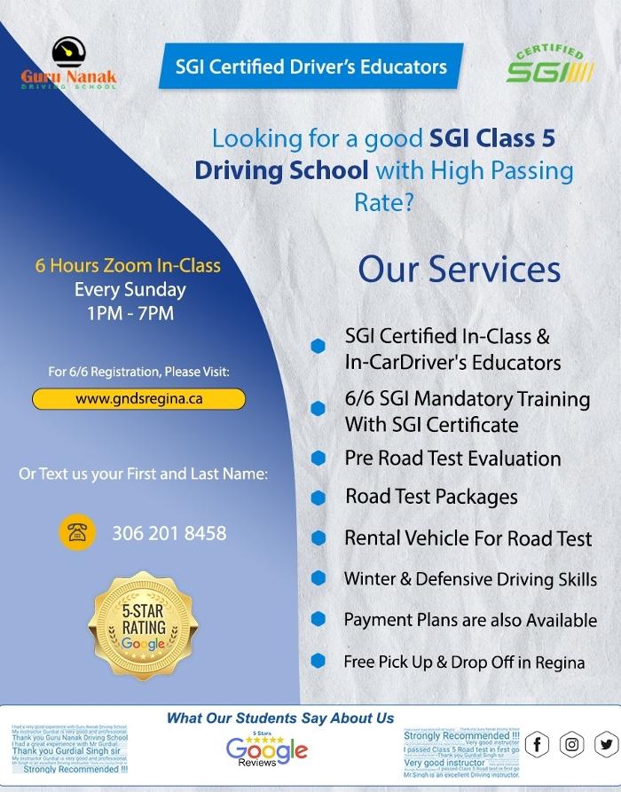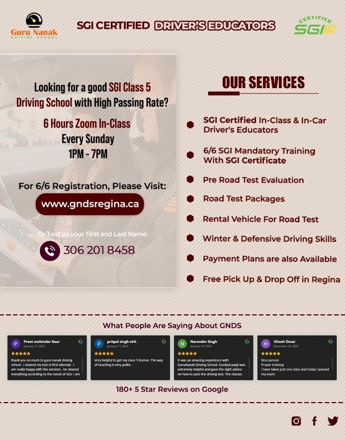 ?? Welcome to Guru Nanak Driving School in Regina and Moose Jaw! ?? Whether you're new to driving and looking for an SGI mandatory 6 and 6 driving education, looking to polish your driving skills before the Road Test or need a Pre-Road Test evaluation for Class 4 or Class 5, we are here to help. You can also rent a vehicle for the Class 4 or Class 5 Road Test.