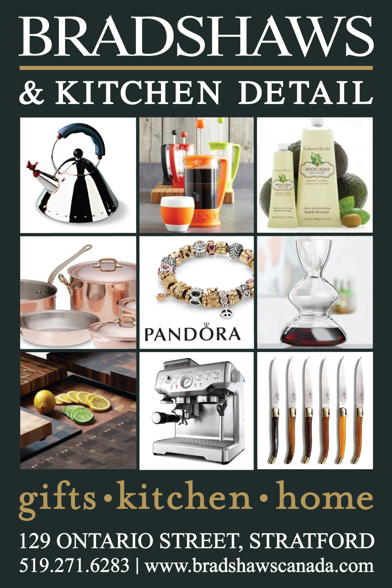 Since 1895, Bradshaws in Stratford has been a destination for gifts, kitchen and products for home and table. Bradshaws also represents many well-known brands, including Pandora jewelry and Crabtree & Evelyn body and bath products. Our impressive kitchen department has everything for the home cook and professional chef including cookware, knives, kitchen gadgets, gourmet food products and more. Bradshaws has everything you need for entertaining and quality products for the home, as well as gifts for men, women and children. We also offer a Bridal Registry service, and our knowledgeable and personable staff encourages our customers to "buy it once and buy it well". An independent, family-run business for over 115 years, our multiple award winning store has been known for quality products at a fair price, from the foremost brands in the industry. No visit to the Stratford area would be complete without a stop at Bradshaws, a truly unique shopping experience.