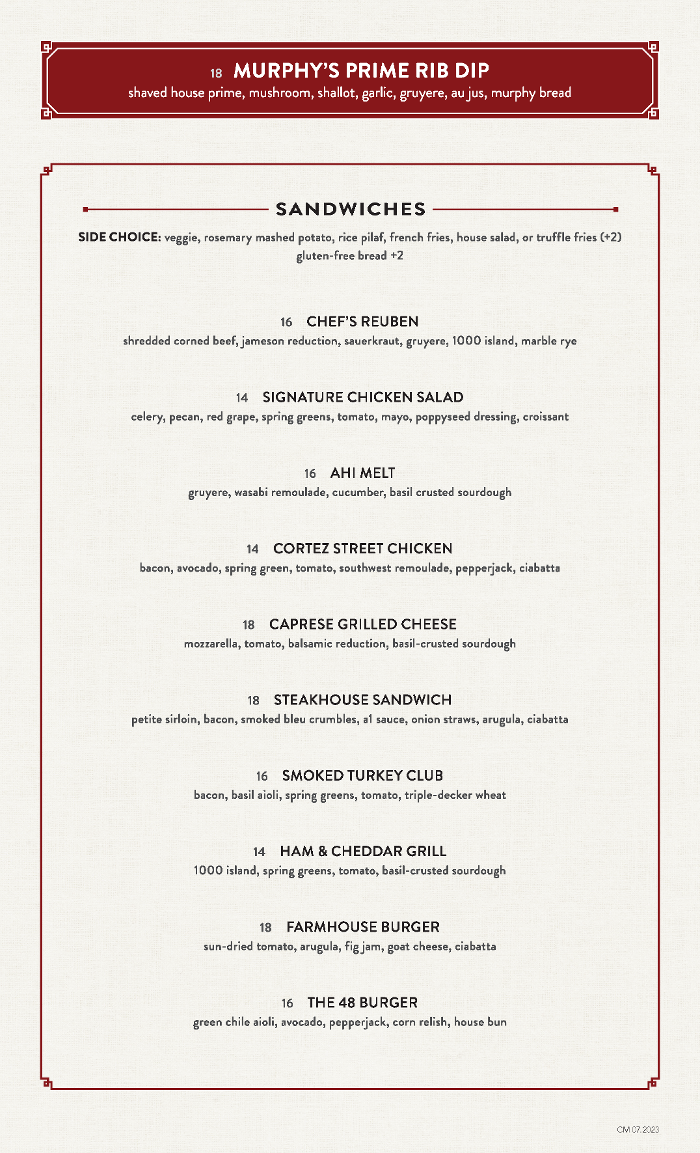 Murphy's historic landmark building was a Mercantile & General Store in the 1890s. Back then, owner J.I. Gardner promised: All Goods Guaranteed to be First Class. Today, Murphy's continues this legacy of quality, serving only the finest, chef-prepared steaks, seafood, and desserts. Enjoy sophisticated lunches, delectable dinners, and relaxing Sunday brunches in an elegant, historic setting. In keeping with the original structure's purpose, we've added charming antiques throughout the space. Take a seat at our gorgeous, century-old mahogany bar for our Happy Hour. Murphy's is also the place for your special occasions, from anniversaries to birthday gatherings. Reserve one of our two private meeting rooms for your private party. Or celebrate with your guests in our special mezzanine area that overlooks the restaurant. With impeccable food, gracious service, and the ambiance of yesteryear, life's moments are more memorable at Murphy's.