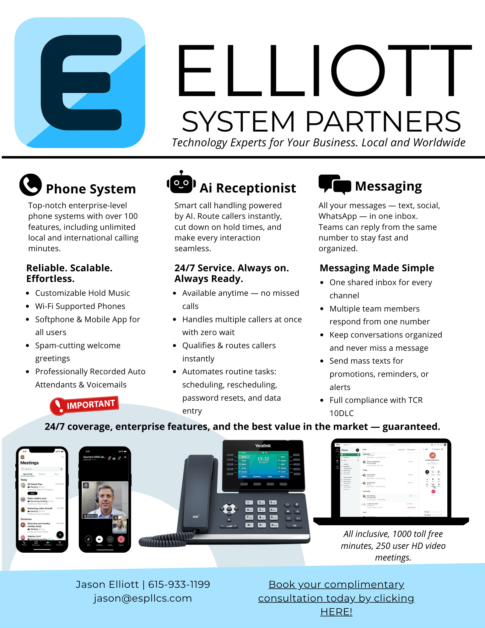 Elliott System Partners is dedicated to helping businesses communicate smarter, faster, and more effectively. We specialize in VoIP phone systems, cloud-based contact centers, AI receptionist services, and high-speed business internet. Our mission is simple: to deliver reliable and future-ready solutions that help companies streamline operations, improve customer experience, and grow with confidence.