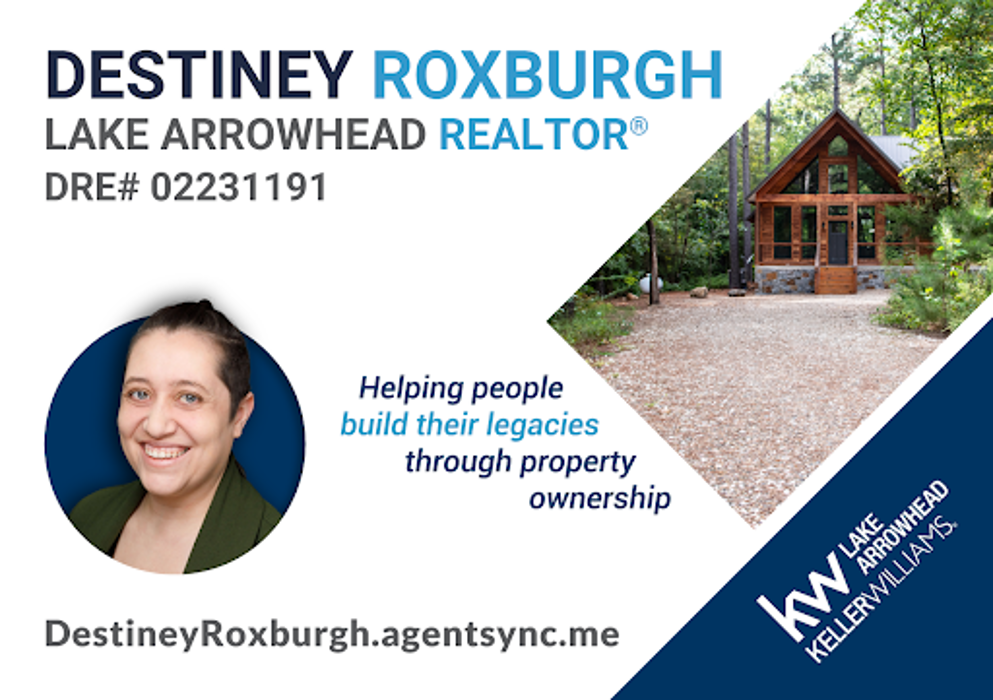 Destiney Roxburgh is a full-time REALTOR with Keller Williams Lake Arrowhead, serving buyers and sellers across the San Bernardino Mountains. She specializes in Lake Arrowhead homes with lake rights, vacation cabins, and mountain investment properties, and is First-Time Buyer Certified. With over 15 years experience in business and marketing, Destiney brings deep expertise in Arrowhead Woods, the ALA, and AWAC, and ' known for success with dock sales on Lake Arrowhead and Big Bear Lake. She proudly serves clients in Running Springs, Crestline, Twin Peaks, Big Bear, and Green Valley Lake, offering hyper-local insight, trusted guidance, strategic marketing support, and a genuine commitment to delivering 5-star client experiences.