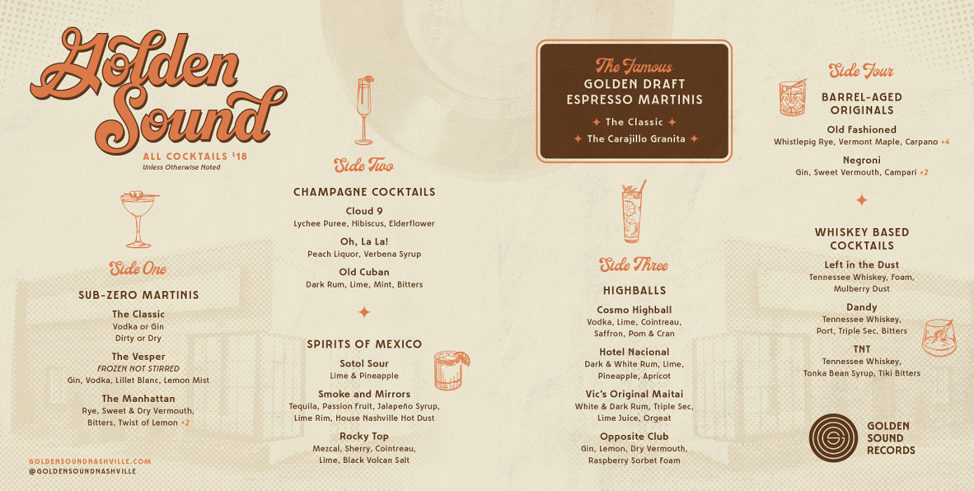 Located in the outskirts of downtown Nashville, Golden Sound's reincarnation as a cocktail bar is all about creating new memories in the same spirit of this historic location. They say music has a way of transcending space and time. With that in mind, we invite you to step inside, leave your worries at the door, and create some timeless magic of your own.