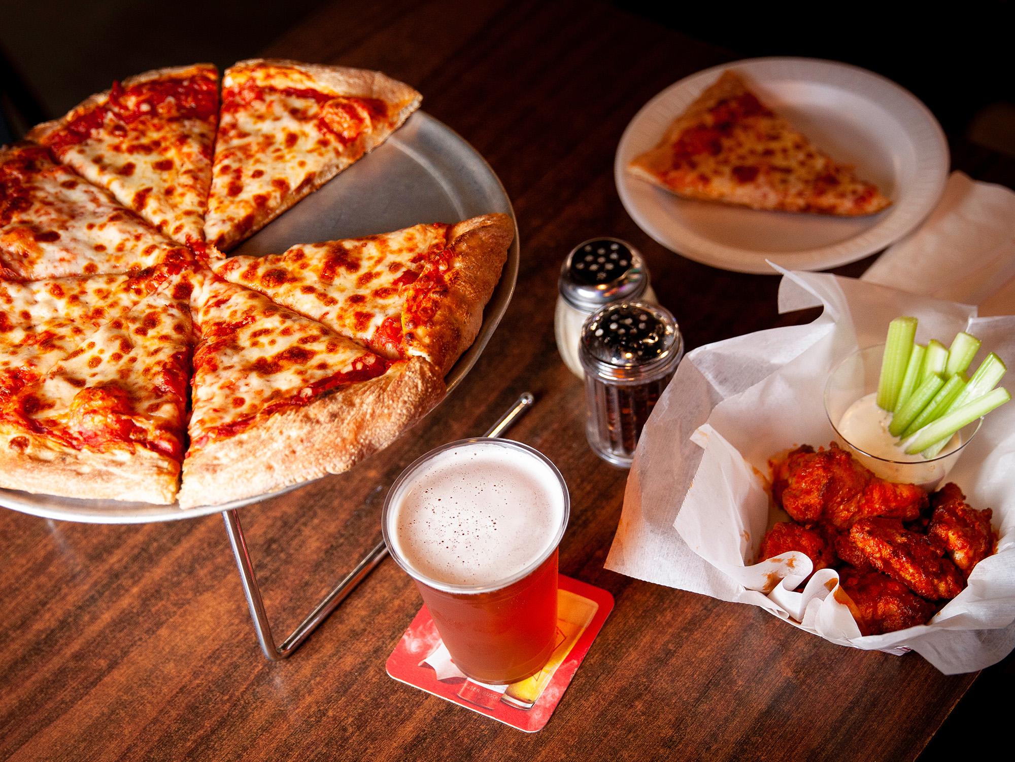 Enjoy pizza, wings, snacks, and a full bar while you’re here.