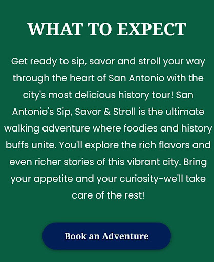 Get ready to tantalize your taste buds with San Antonio's most delicious food and drink experiences! Sip, savor, and stroll your way through our mouthwatering food tours that showcase the best culinary delights the city has to offer. From the vibrant Riverwalk or brunch tour our guided tours combine history, culture, and of course, plenty of tasty treats and a lot of fun. Whether you're looking for a family-friendly outing or a romantic date day, our tour is offered in both English and Spanish (when available) ensuring everyone will have a flavorful adventure. Join us for a unique culinary experience that will leave you craving more! There is a chance of winning a Kilwins gift card!