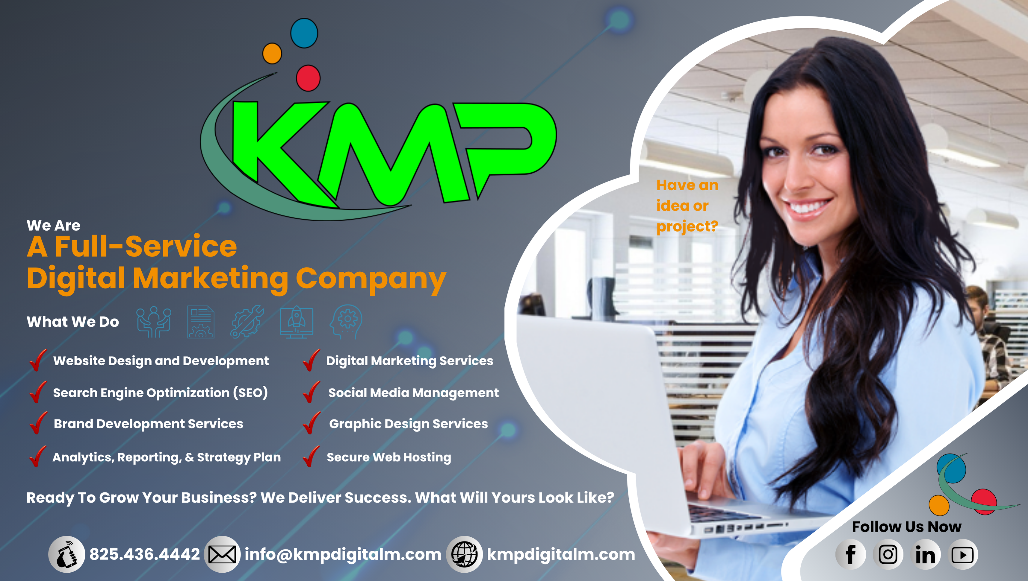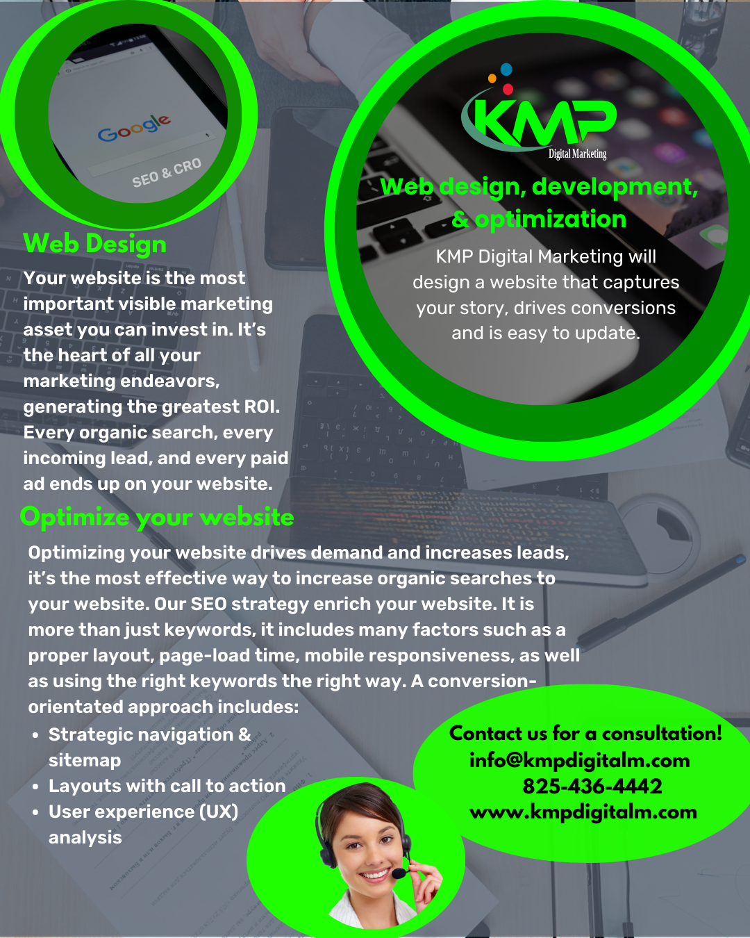 KMP is a passionate professional full-service Digital Marketing company in Bonnyville Alberta. Providing web design and development, SEO and CRO services, digital marketing strategies, social media management. Our approach is simple, dedication to our clients and community, responsiveness & quality, helping businesses get noticed with a unique website that works for them. This includes designing, developing and optimizing appealing websites that are fast, easy to update, SEO focused, and drive conversions. We use Google ads with PPC, social media, and e-mail marketing to grow your reach and get your message where it matters most. KMP digital marketing offers services every local business needs to succeed online.