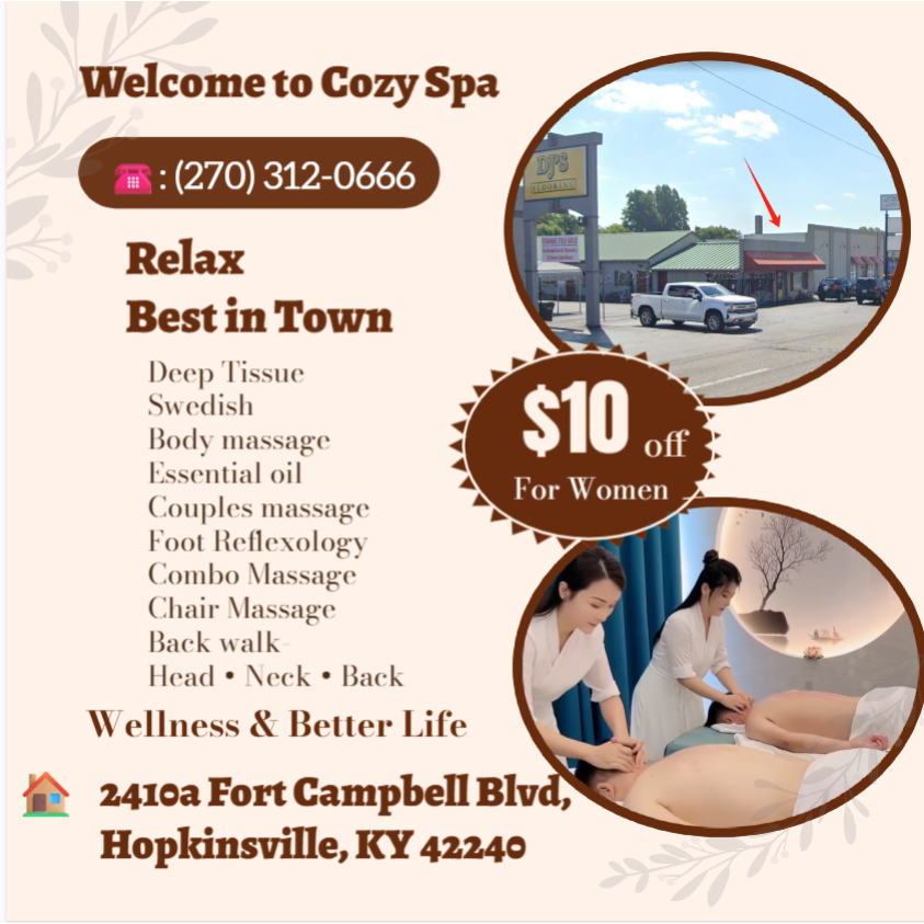 ... serene retreat for unparalleled relaxation and rejuvenation in Hopkinsville, KY. We specialize in providing top-notch Asian massage services that cater to your complete well-being. Whether you're looking for a full-body massage ...